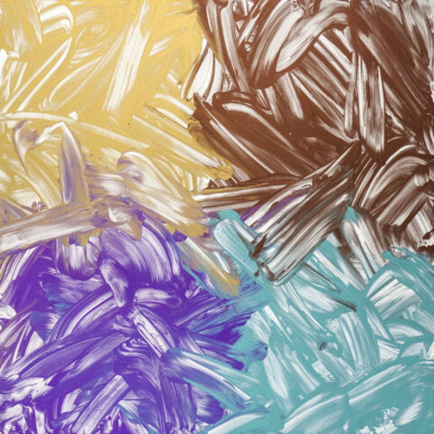 Chiharu Yakushigawa, painting with her hands and feet, creates vibrant compositions where diverse colors merge yet coexist in harmony, expressing the richness of coexistence.